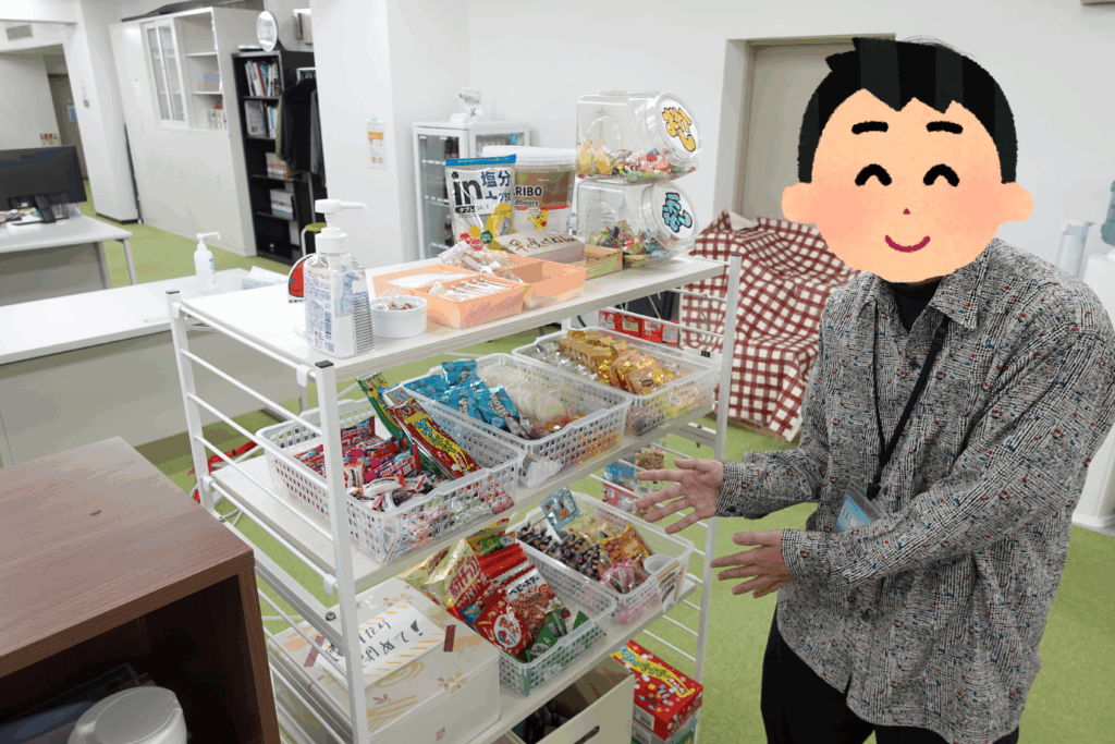 お菓子コーナーは好きに取っていいよ、食べていいよということで、自分なんかはグミとか茎わかめ好きなので、よく食べさせていただいてます笑