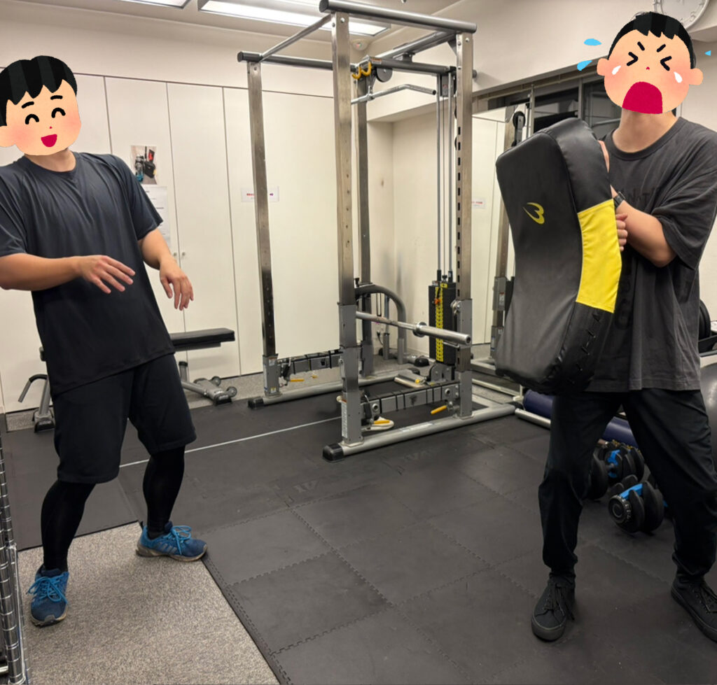 ウェイトトレーニングの後は、ジムに置いてあったミットを使ってキックボクシング体験をしました。
