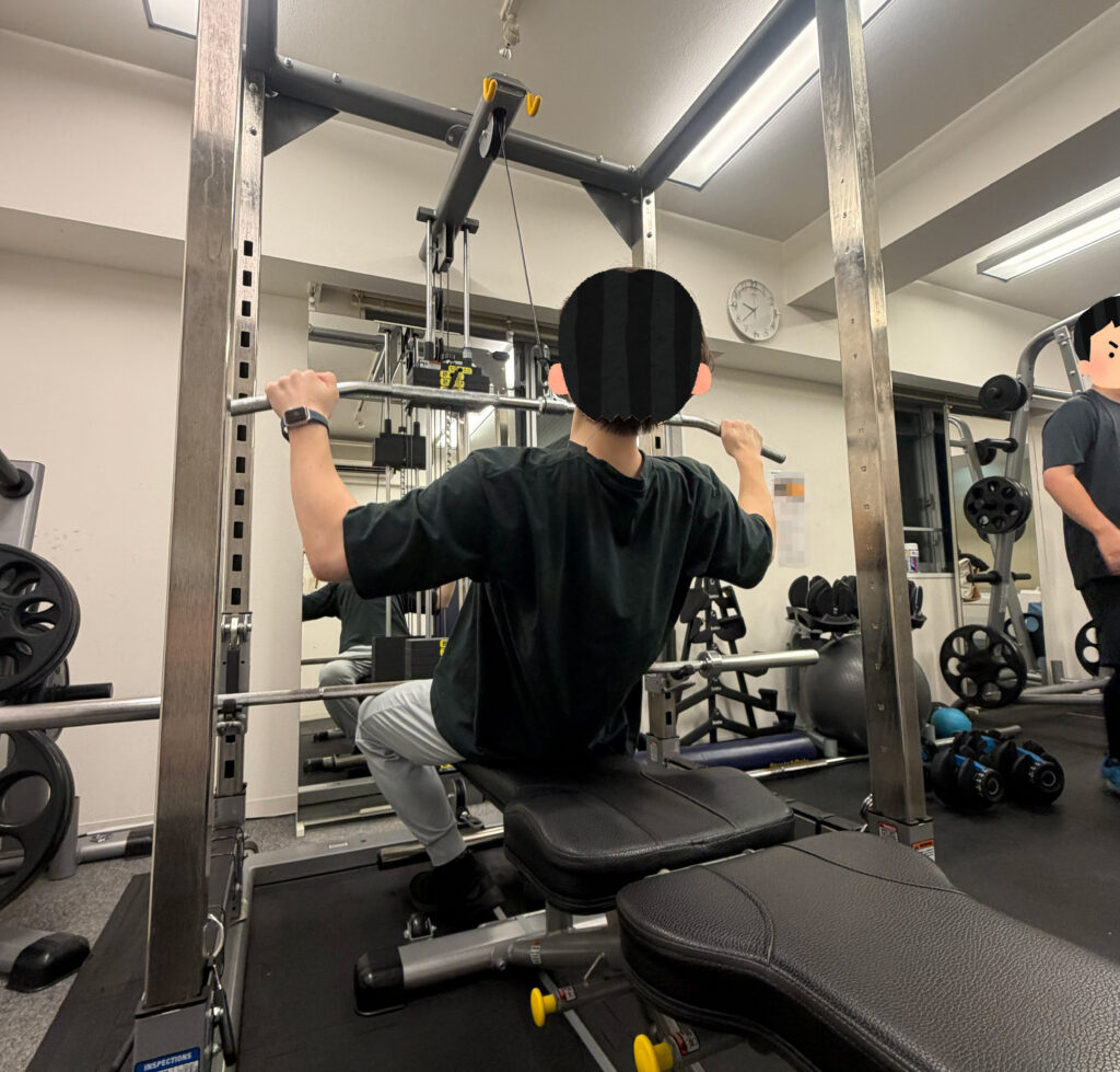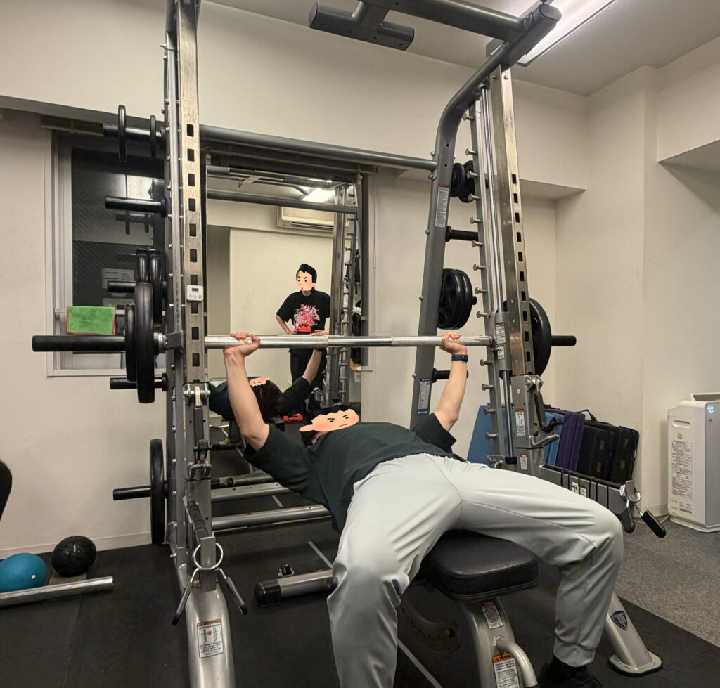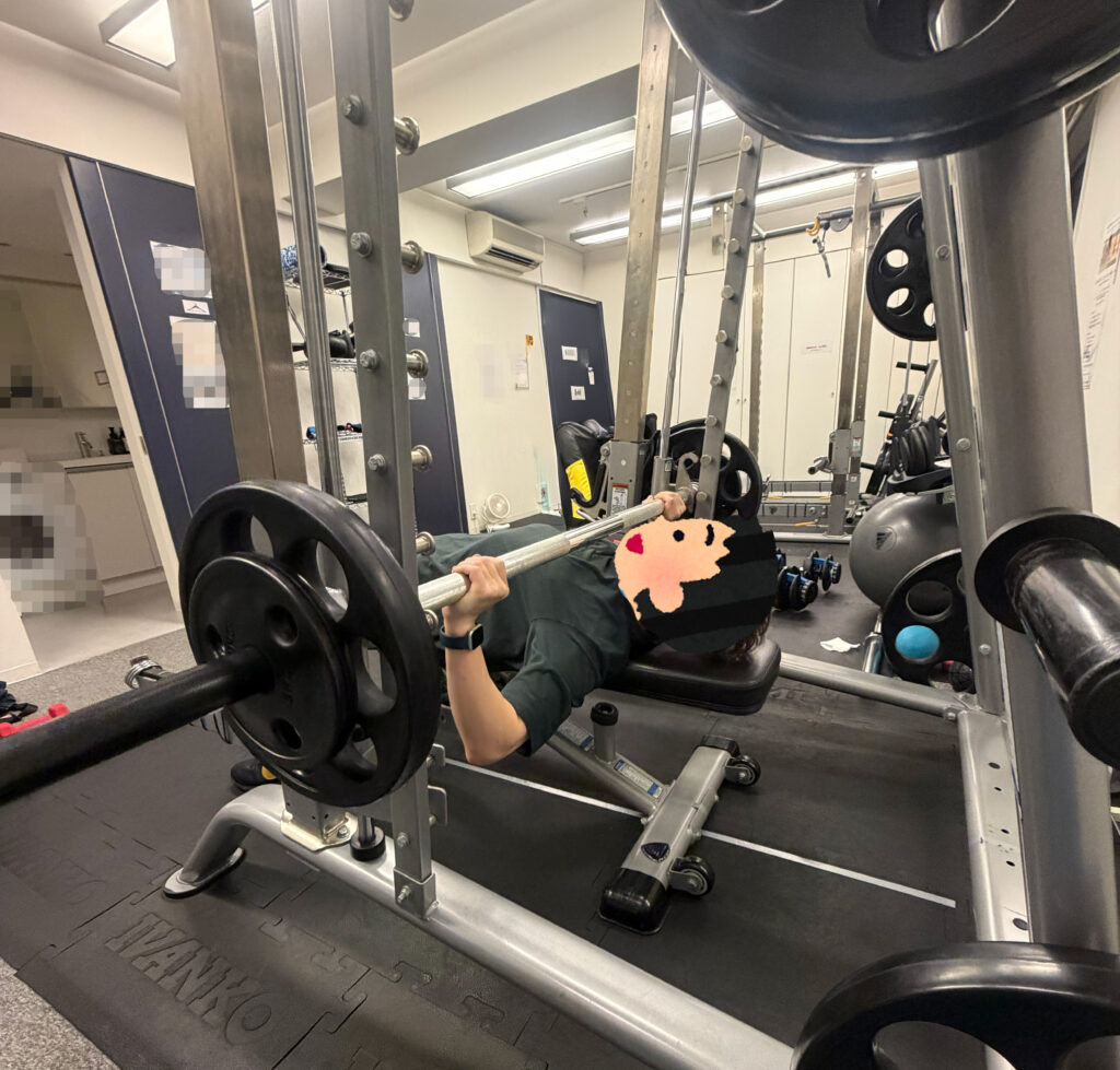 バーベルを使って胸や腕、肩を鍛える、筋トレの王道中の王道です。(今回はスミスマシン)