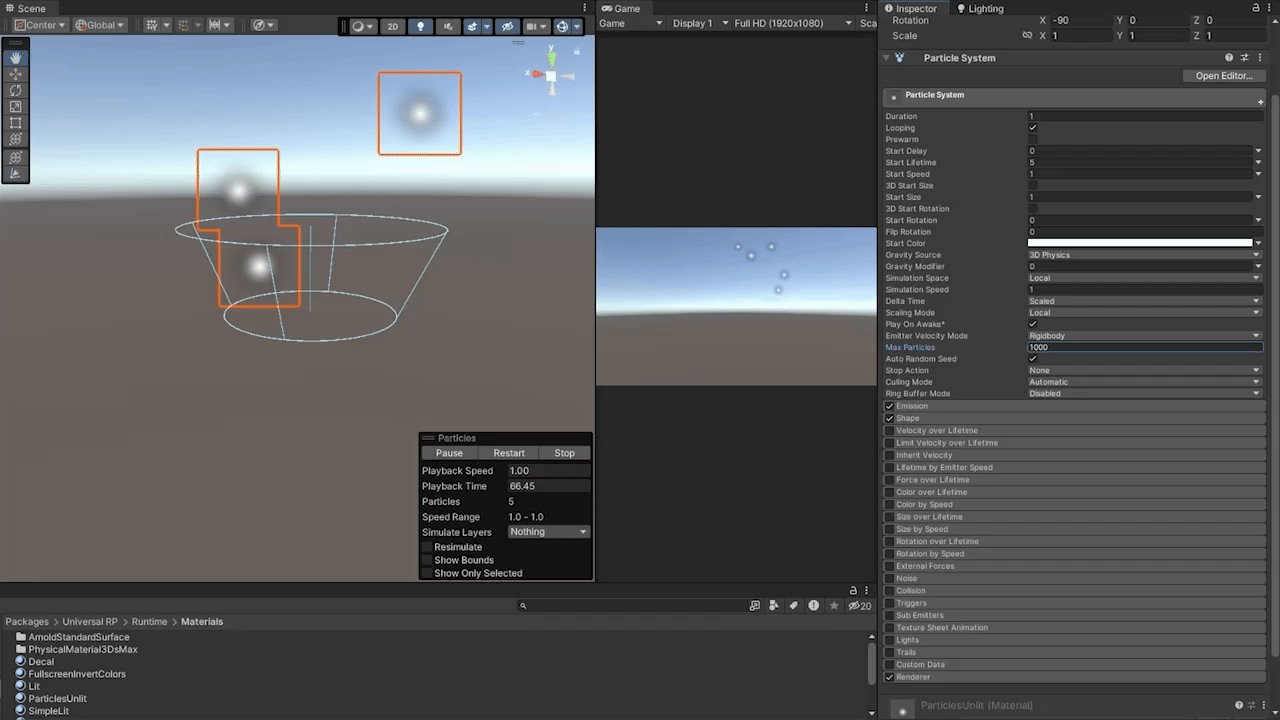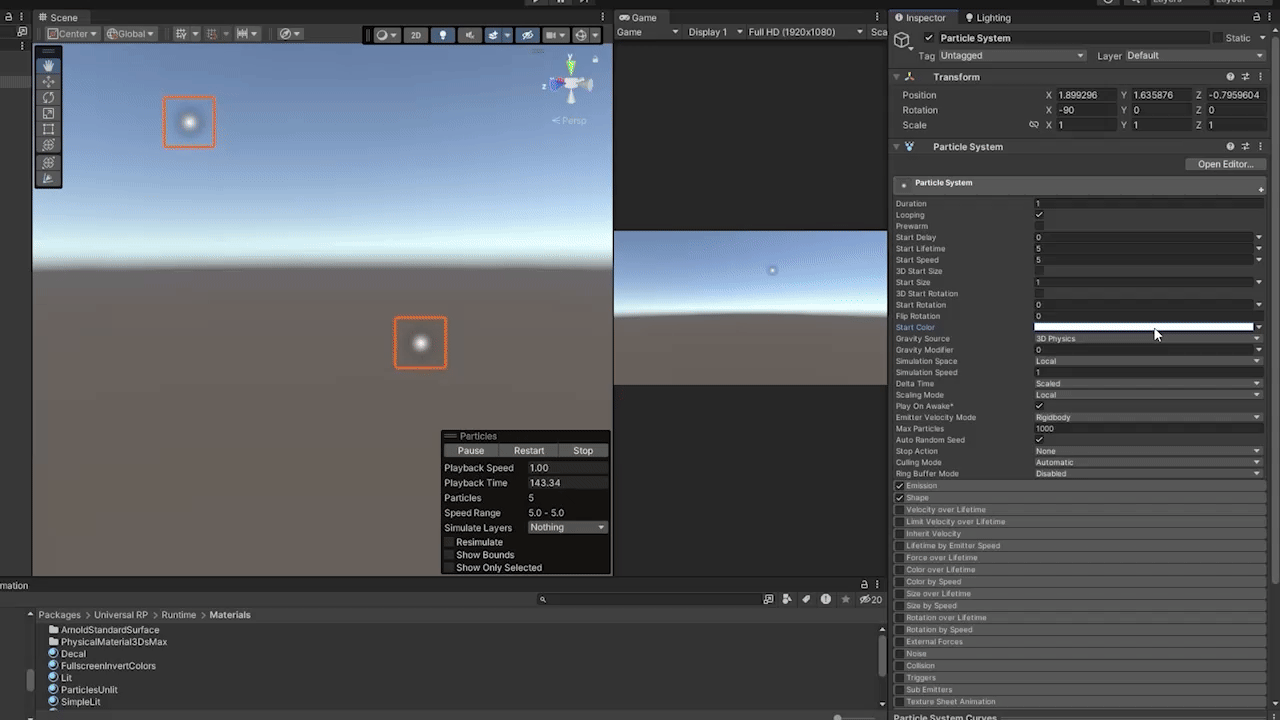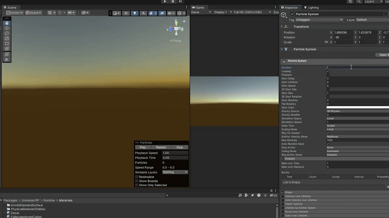 またParticle Systemの持続時間と発生したパーティクルの寿命とは別なので注意してください。
