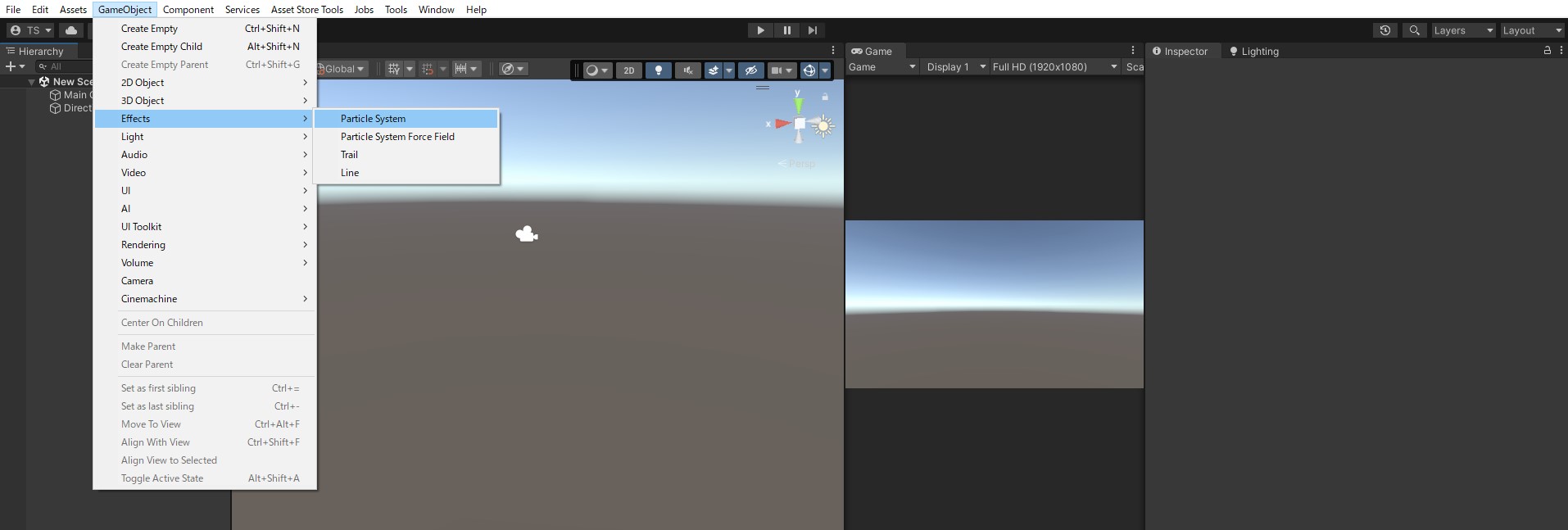 - Unityを開き、GameObjectメニューから Effects → Particle System を選択。