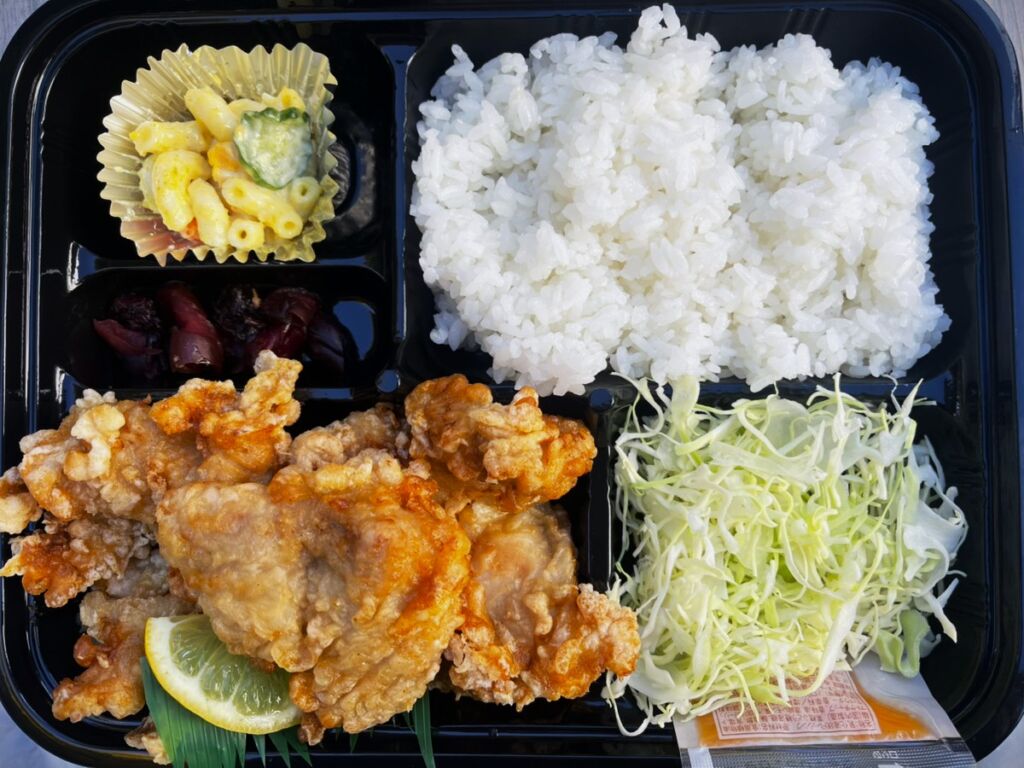 写真は人気の「鶏唐揚げ弁当」で、お肉が柔らかくてボリュームもたっぷり。